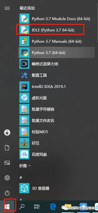 9.打开桌面左下角开始菜单,找到【IDLE(Python 3.7 64-bit)】的图标,双击打开