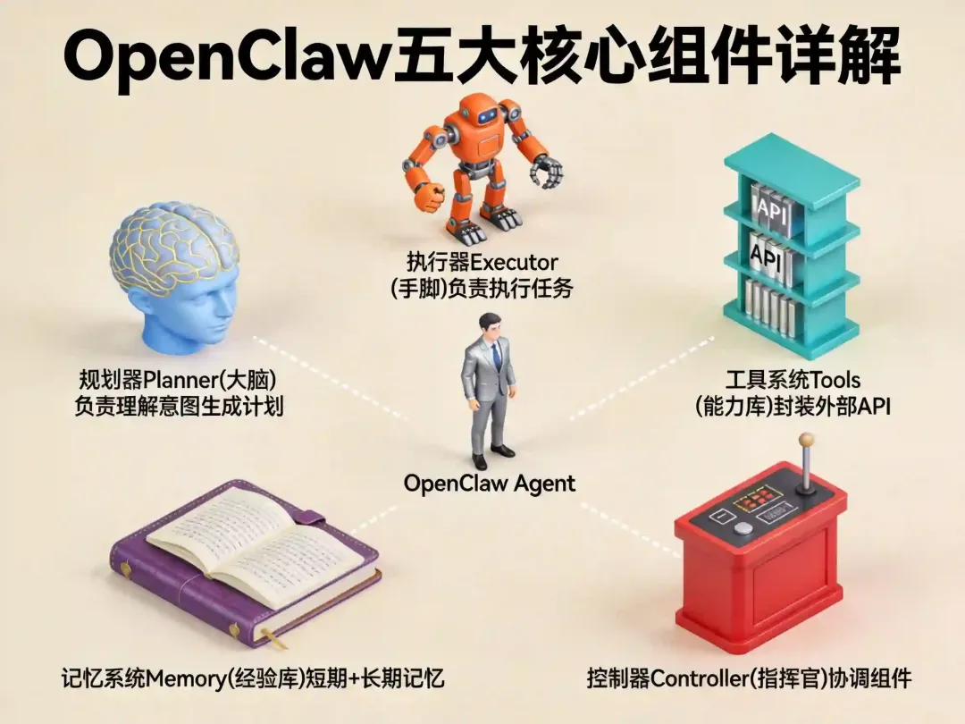 OpenClaw打破了传统的三层架构,提出了组件化Agent架构的新思路。它把Agent拆成5个独立的组件: