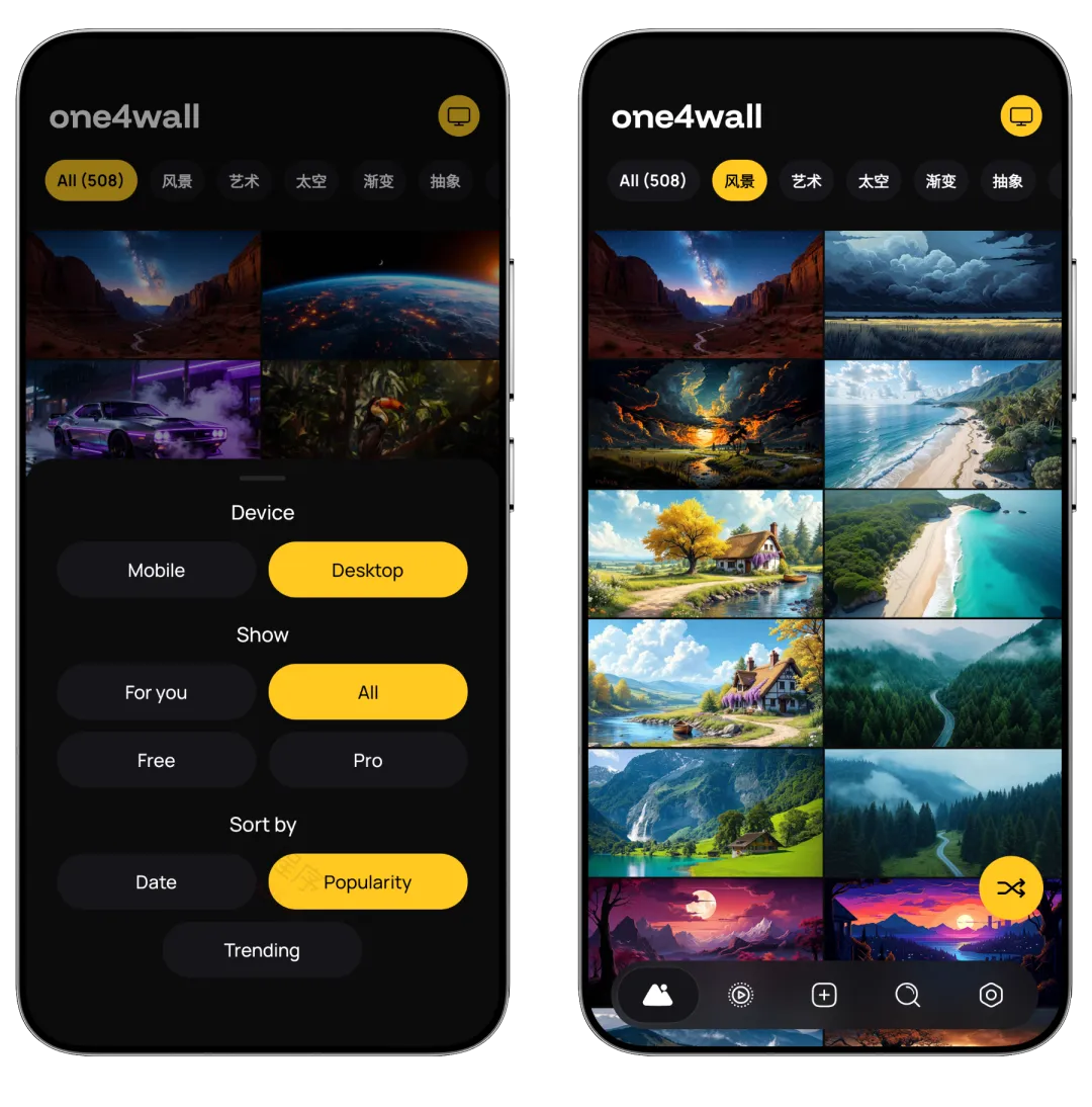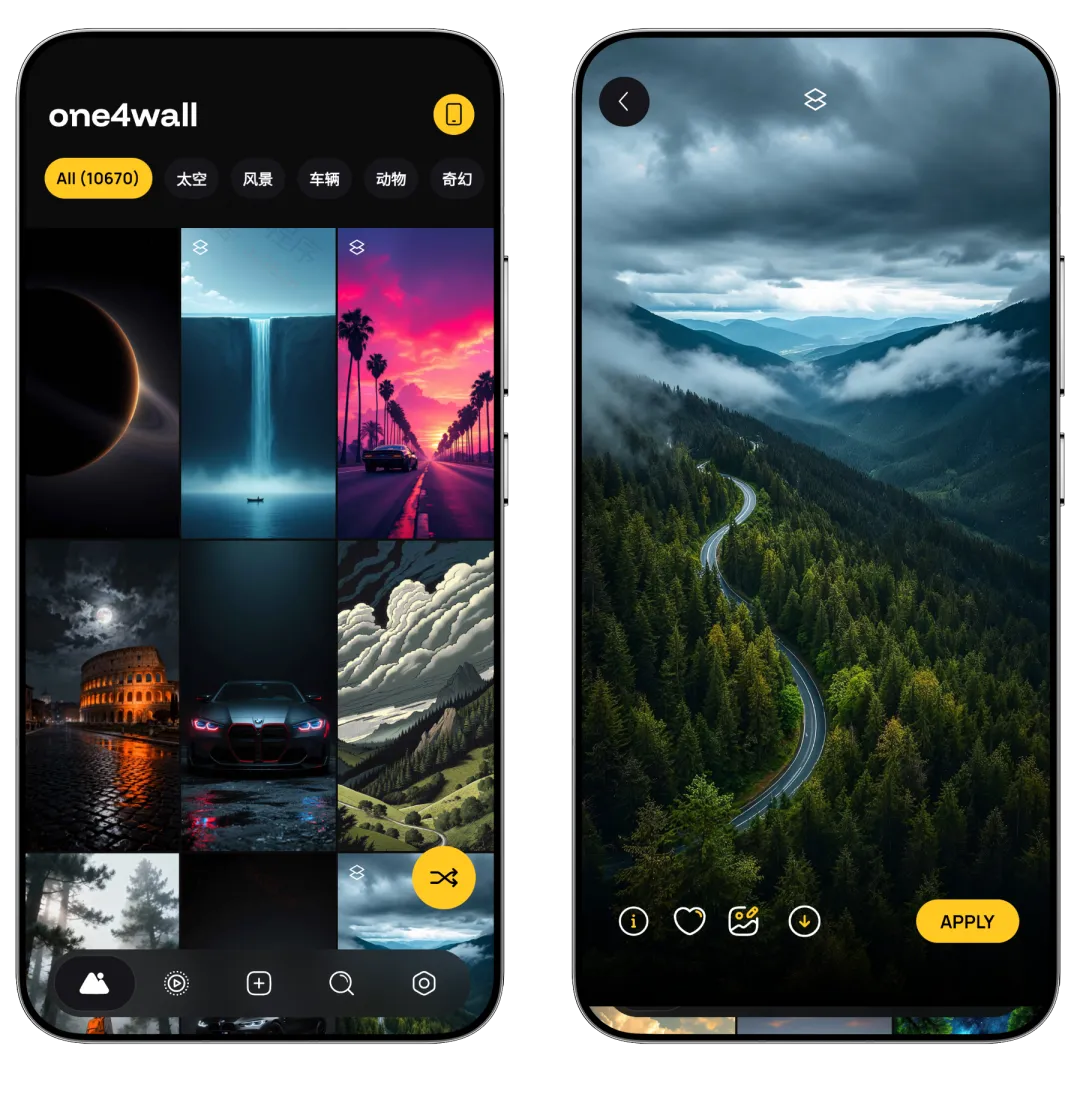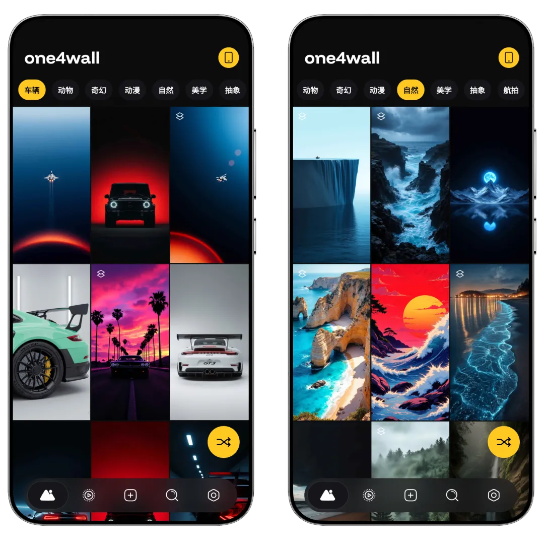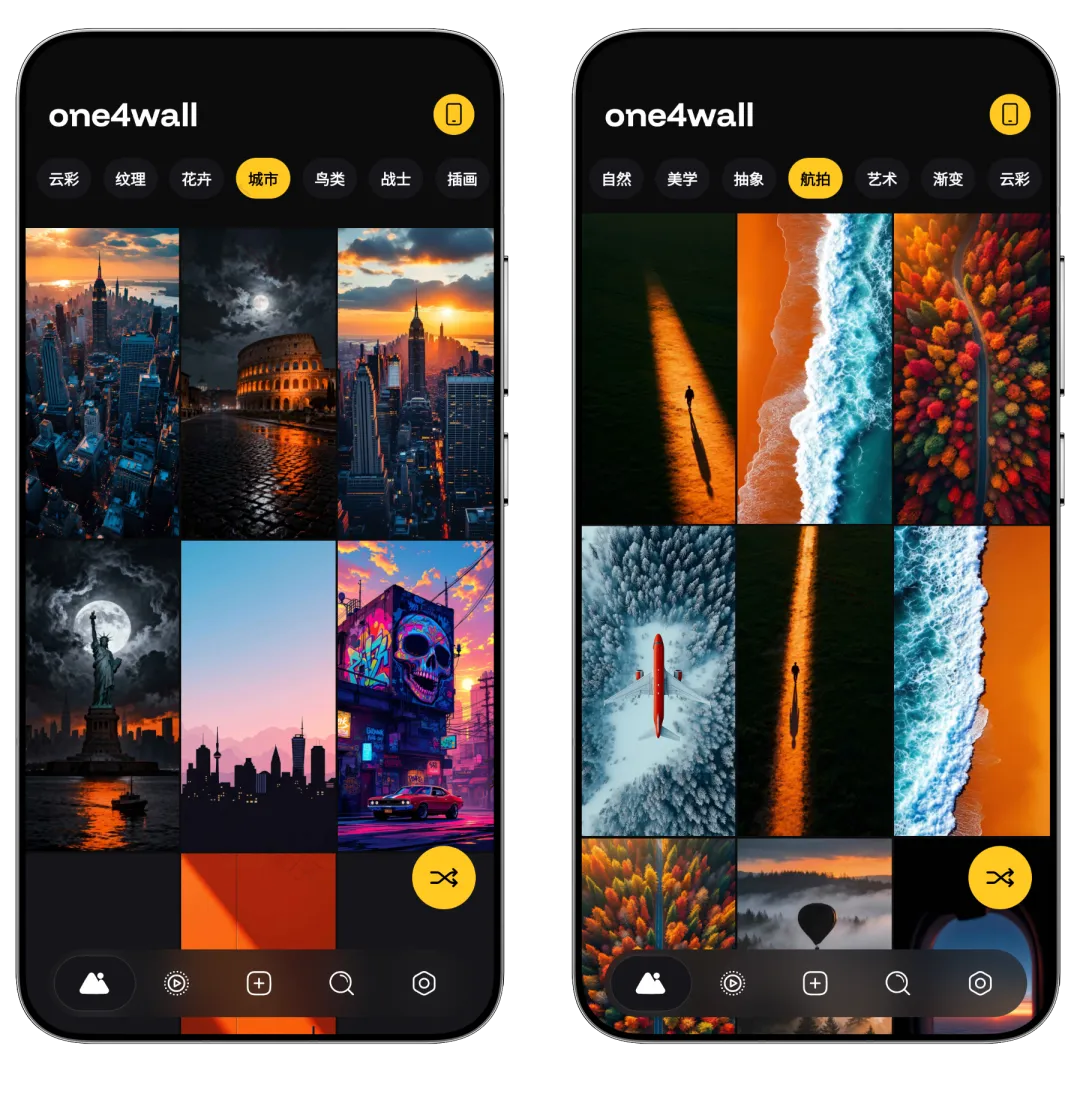 解锁PRO会员,无限制下载,去更新永不失效【请勿贩卖】One4Wall 作为一款主打桌面个性化的壁纸App,软件内置数千张独家 4K/8K超高清壁纸,涵盖自然、动漫、AMOLED、复古、抽象等30+热门分类,适配手机和电脑等多设备,所有资源均经One4Studio团队手工编辑或AI 生成,确保独特性与细腻质感。
