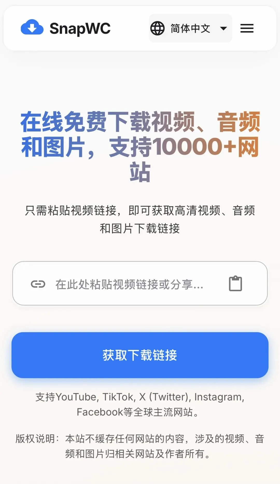 在线免费下载视频、音频和图片,支持10000+网站支持YouTube, TikTok, X (Twitter), Instagram, Facebook等全球主流网站。网址:https://snapwc.com/zh