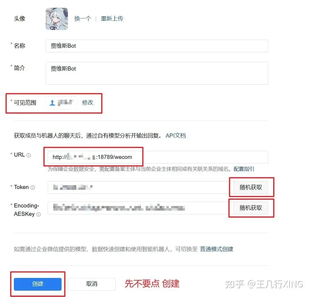 下图是企业微信创建智能机器人的配置界面,可以看到需要填写名称、URL、Token 和 EncodingAESKey: