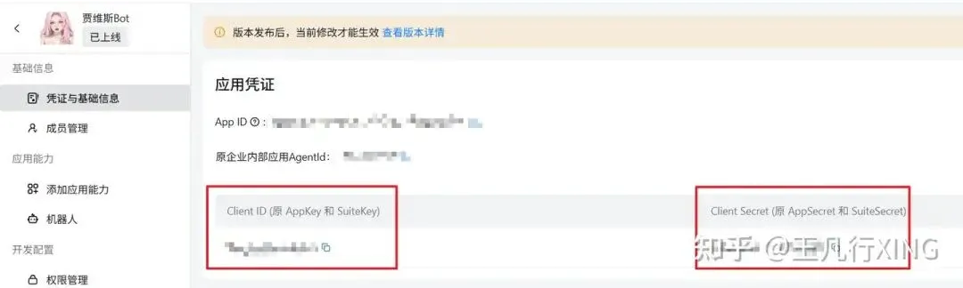 下图是钉钉开放平台的应用凭证页面,红框标注了 Client ID 和 Client Secret 的位置: