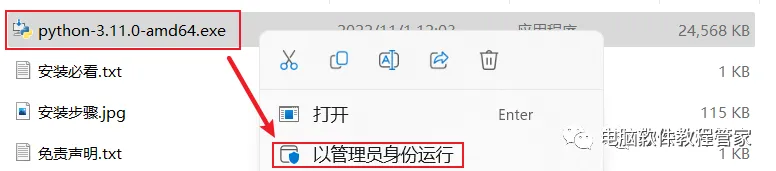 2、点击鼠标左键选中“Python3.11.0-amd64.exe”,右选择键以管理员身份运行