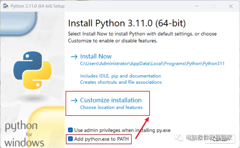 3、勾选“Add Python to PATH”,点击“Customize installation”