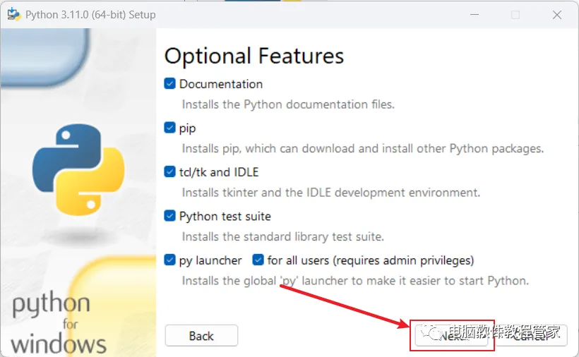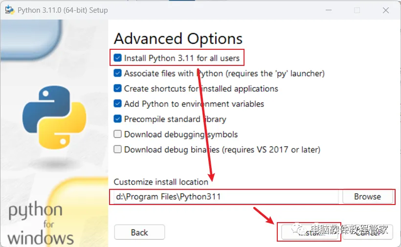 5、先选中“install Python 3.11 for all users”,选择安装路径,最后点击“install”进行安装