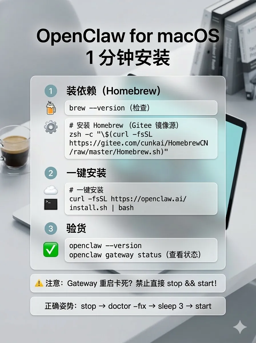 # 1. 安装 Homebrew(如已安装可跳过)/bin/zsh -c "$(curl - fsSL https://gitee.com/cunkai/HomebrewCN/raw/master/Homebrew.sh)"# 2. 一键安装 OpenClawcurl -fsSL https://openclaw.ai/install.sh | bash