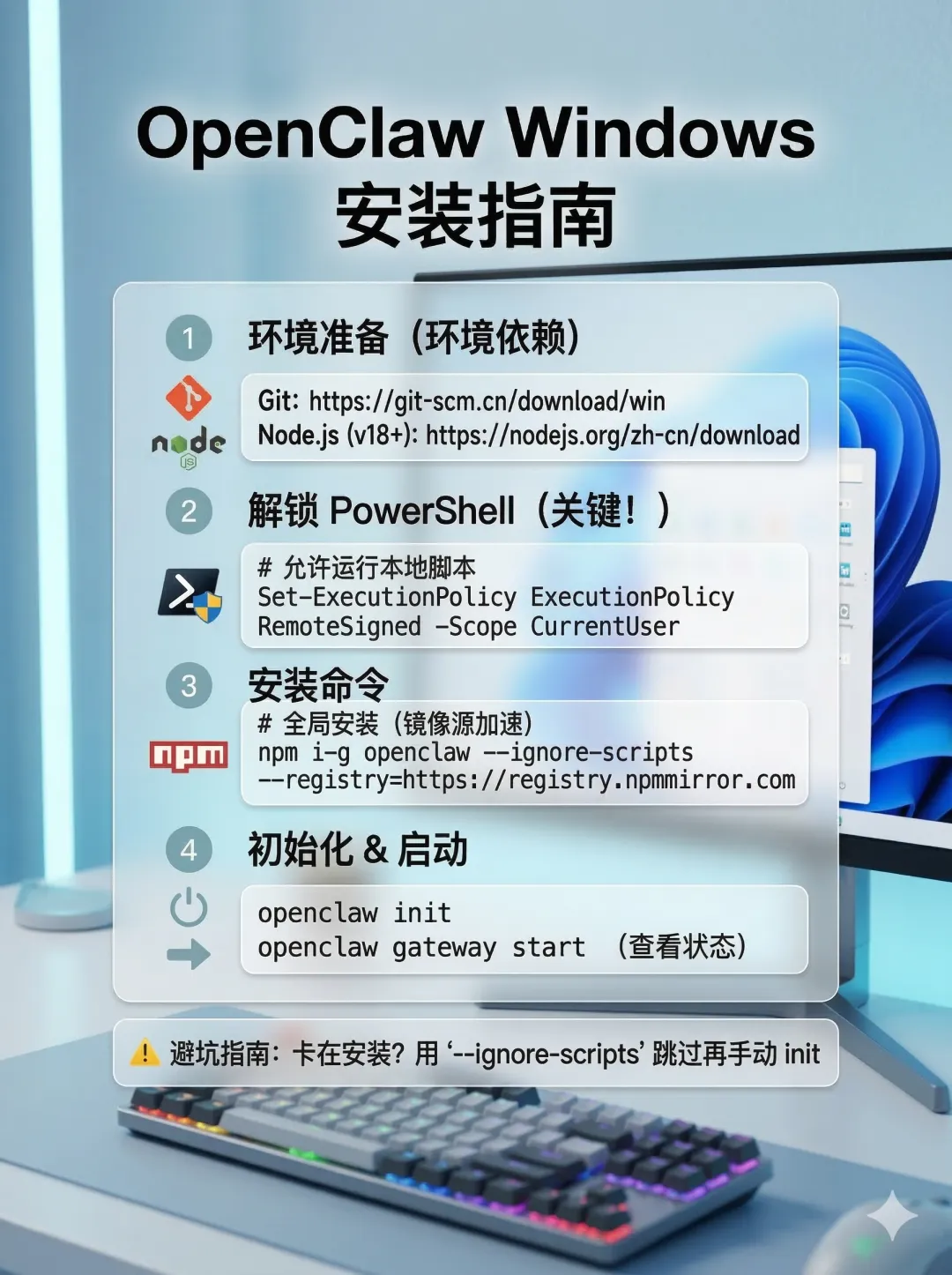 # 1. 下载安装 Githttps://git-scm.cn/install/windows# 2. 下载安装 Node.js (LTS 版本)https://nodejs.org/zh-cn/download# 3. 以管理员身份打开 PowerShell,设置执行策略Set-ExecutionPolicy-ExecutionPolicy RemoteSigned -Scope CurrentUser# 4. 安装 OpenClawnpm i -g openclaw --ignore-scripts--registry=https://registry.npmmirror.com