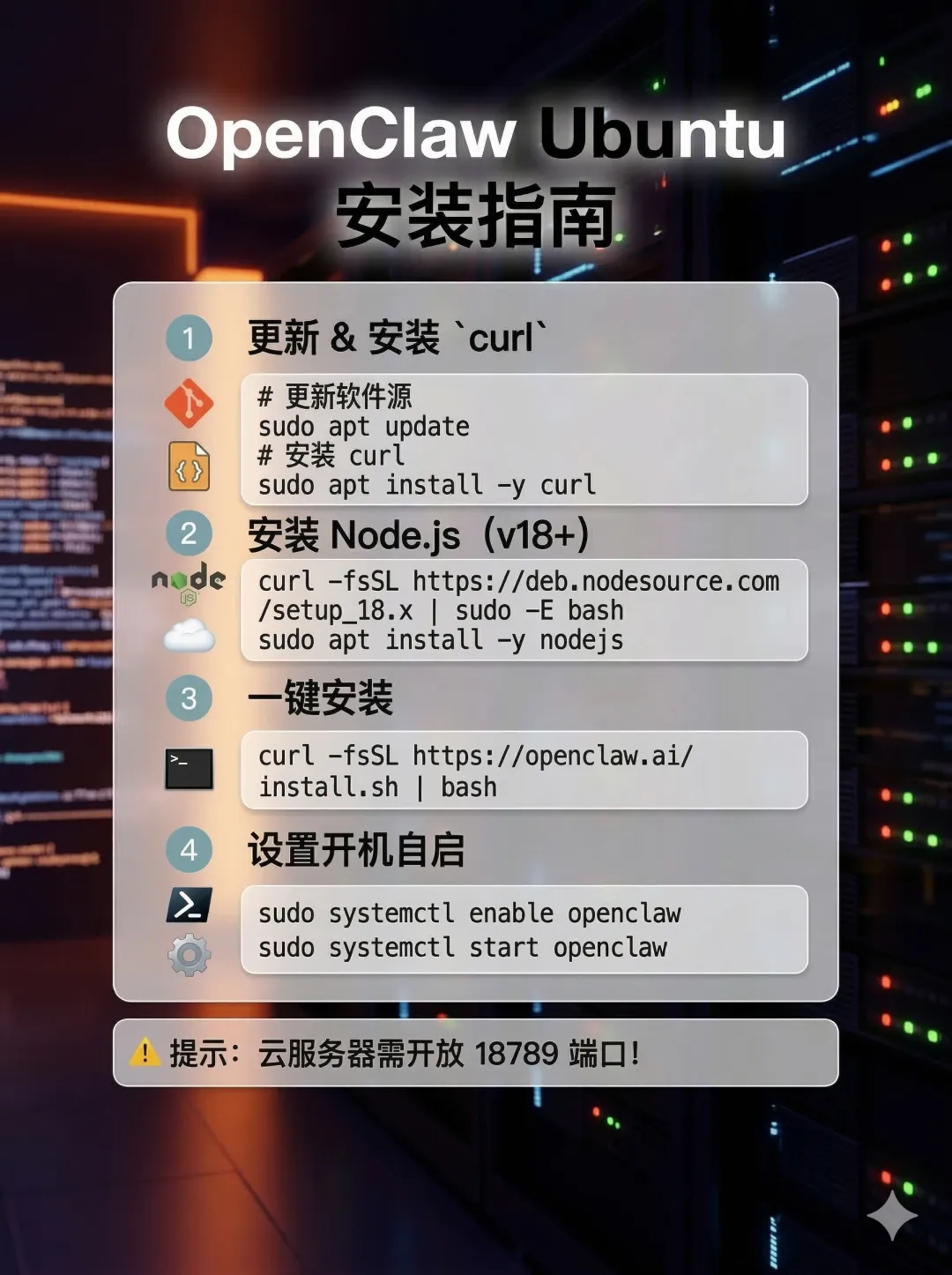 # 1. 更新软件源并安装 curlsudo apt update && sudo apt install -y curl# 2. 一键安装 OpenClawcurl -fsSL https://openclaw.ai/install.sh | bash