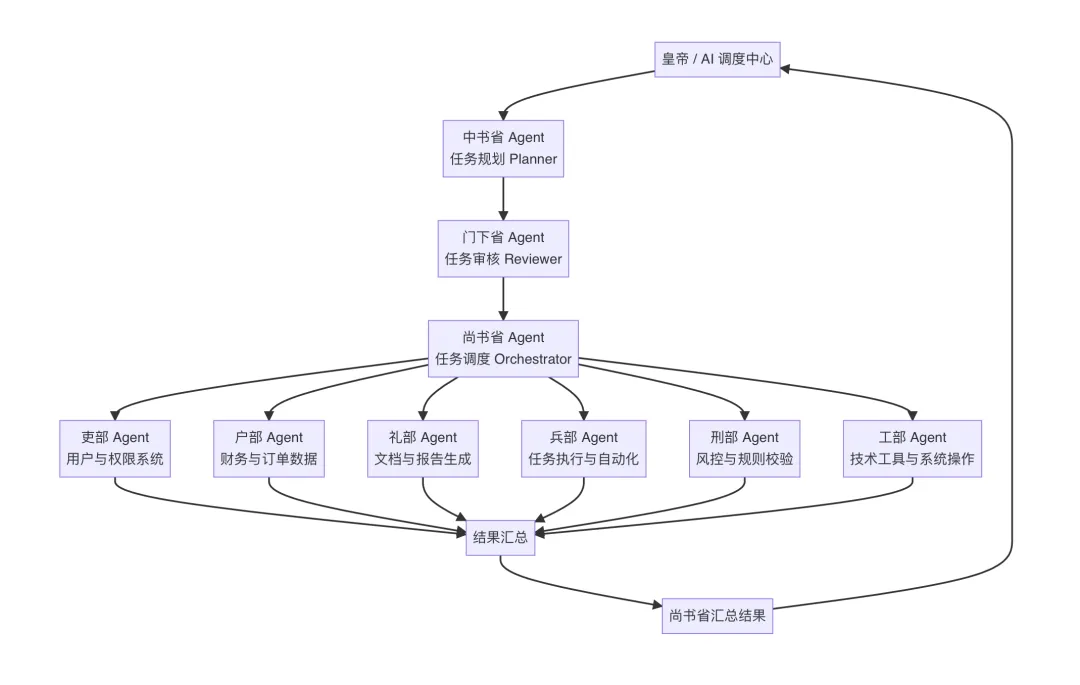 有些网友非常聪明,使用老祖宗流传下来的三省六部制,很形象的表示了多 Agent 的工作流程。中国古代皇帝其是也是为了解决大规模复杂组织如何有效管理问题而想出来的方案,因为三省六部本质就是一个任务拆分与执行体系,而 Agent 系统也是做同样的事情:接收任务 → 拆解任务 → 执行任务 → 汇总结果。(AI 进入封建时代了吗?)