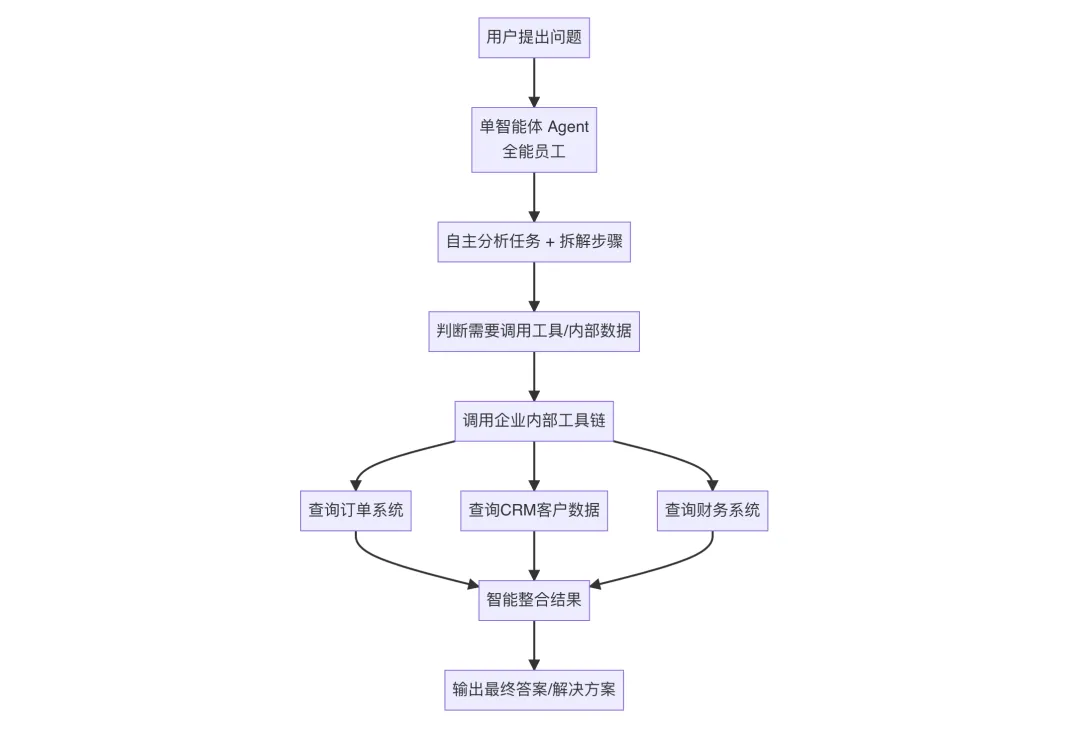 不过,单 Agent 和直接使用大模型聊天其实有一个本质区别。Agent 并不是随机生成答案,而是一个可定义流程的任务执行系统(Workflow)。整个执行过程是可控的,例如: