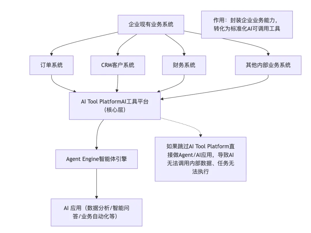 其中,第一类能力需要我们自己搭建,企业系统本来就存在,例如订单系统、CRM、财务系统,AI 想执行任务,必须调用这些系统,所以必须有一层工具平台,把企业能力封装成 AI Tool。