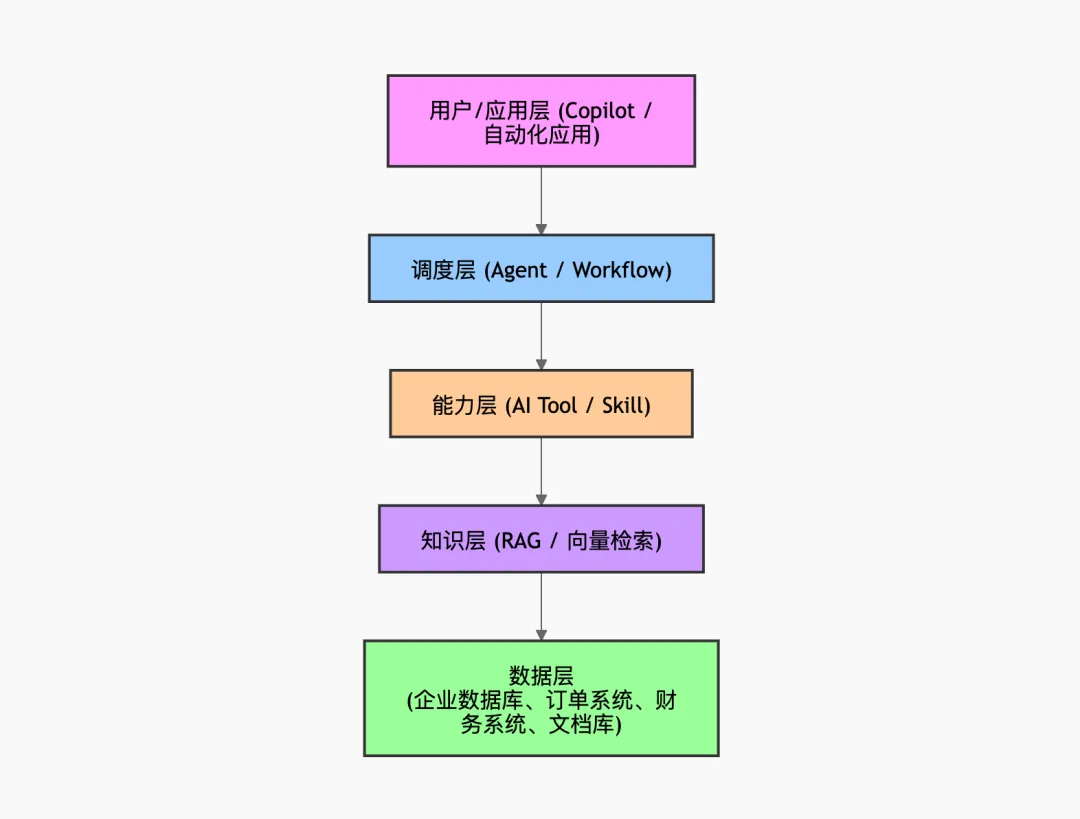 第五层是应用层(Copilot / 自动化应用)。这一层是用户最终看到的界面,例如企业内部助手、客服系统插件、小程序入口、运营后台插件等。用户通过这些界面与 AI 交互,而底层的复杂流程都会被隐藏。
