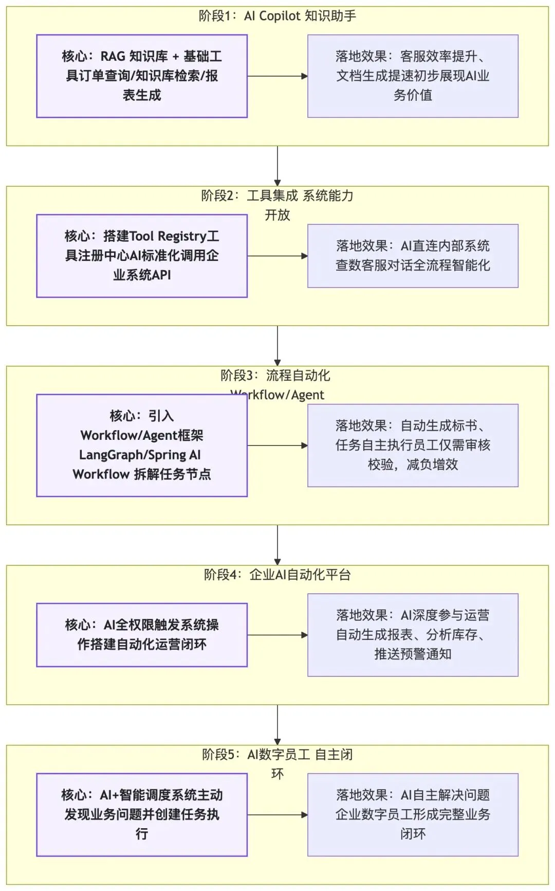 当企业开始落地 AI 时,应用形态通常会经历一个逐步演进的过程。我下面给出从 0 到 1 的可具体实施的实现路径,从简单的辅助工具,到真正能够执行任务的自动化系统,一般可以分为五个阶段。