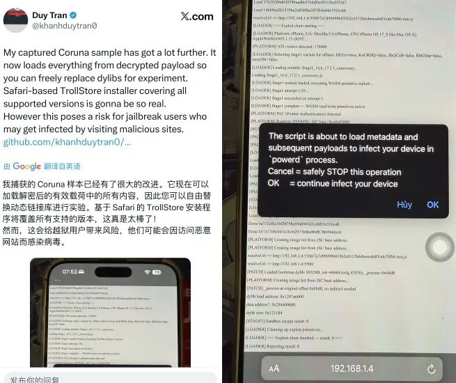 感谢!Google 小组发现 Coruna 漏洞,也感谢 Duy Tran 大佬成功解密 Coruna 样本,没有他们的话,我们无法利用 Coruna 漏洞实现我们要的效果。