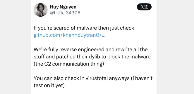 关于 Coruna 漏洞感染存在风险的问题,Little_34306 开发者对此解答,对此漏洞已经完全逆向重写所有代码,并且修补他们的动态链接库以阻止恶意软件C2通信部分,意思已经拦截原来动态链接。