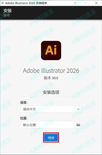 3、点击右下角灰色的小文件夹图标,然后点击【更改位置】设置AI 2026软件的安装路径,建议安装在除C盘以外的磁盘,用户可自行设置。设置好安装路径后点击【继续】。