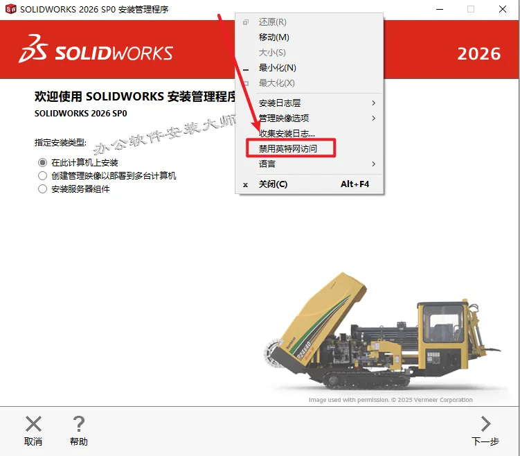 15.鼠标移动到安装界面的顶部位置,右键点击【禁用英特网访问】。(一定要选择禁用网络,否则会安装出错)