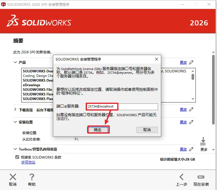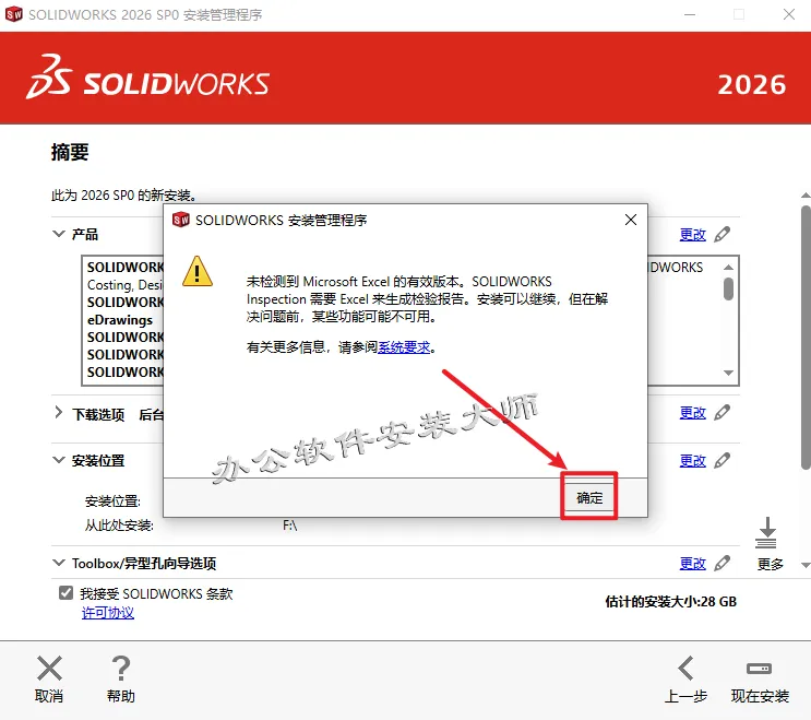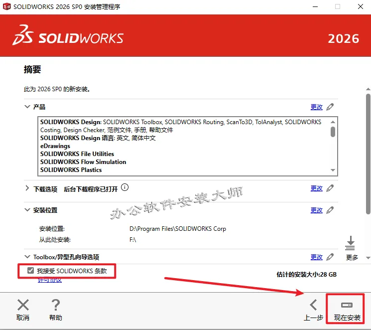 20.先勾选【我接受SOLIDWORKS条款】,然后再点击【现在安装】。