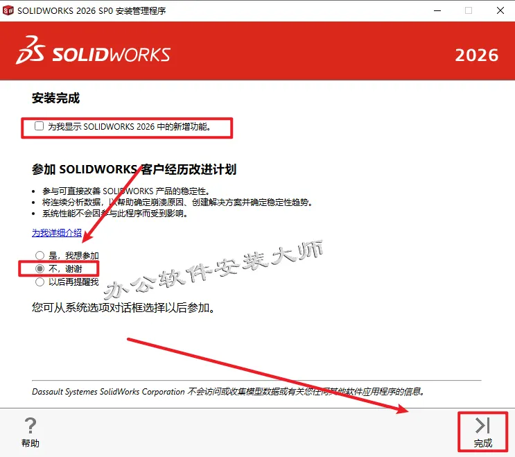 24.安装完成后,先取消勾选【为我显示SolidWorks 2026 中的新增功能】,然后选择【不,谢谢】,最后点击【完成】。
