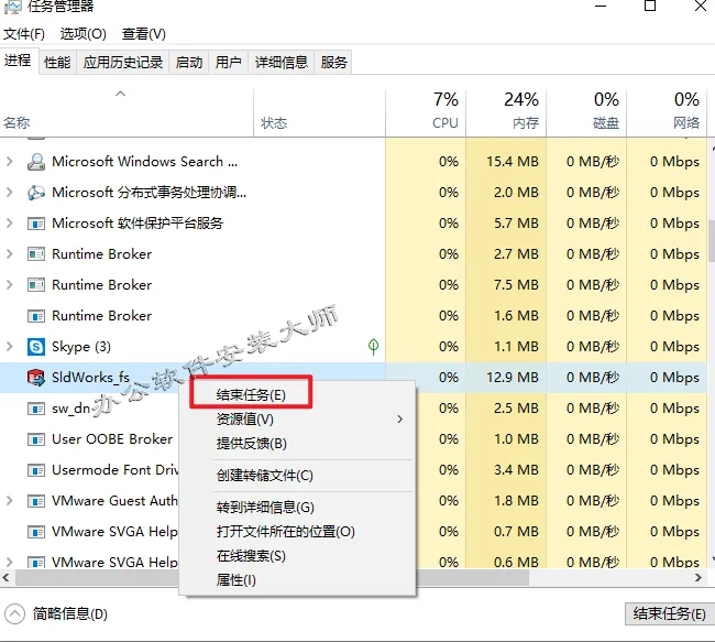 25.打开任务管理器,找到选中【sldworks_fs】鼠标右键选择【结束进程】。(可以同时按键盘Ctrl+Shift+Esc打开任务管理器)