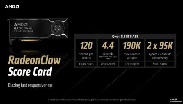 运行 Qwen 3.5 35B A3B 模型时,该配置可实现约每秒45 个 token 的处理速度,处理 1 万个输入 token 约需 19.5 秒,并支持高达 26 万 token 的上下文窗口,可同时运行最多六个智能体。AMD 将其定位为能够在消费级硬件上进行“智能体集群”实验的方案。