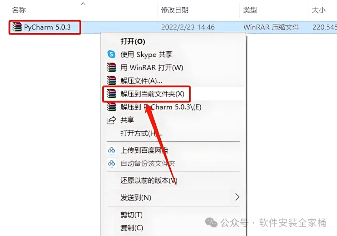 1、下载PyCharm 5.0.3软件安装包到电脑上,右键选择【解压到当前文件夹】