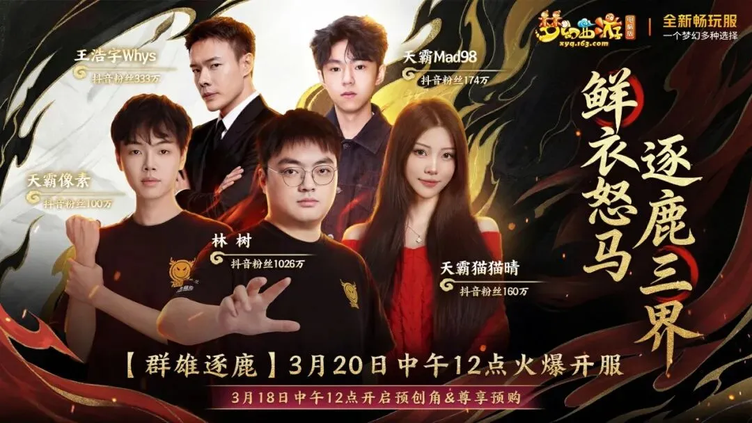 2026 年 3 月 20 日 12:00,让我们齐聚【群雄逐鹿】,与超级明星玩家@林树、@王浩宇Whys、@天霸猫猫晴、@天霸Mad98、@天霸像素 天霸天团一同仗剑三界,以侠为名,以梦为马,在三界之中乘风破浪,一同书写全新梦幻传奇!