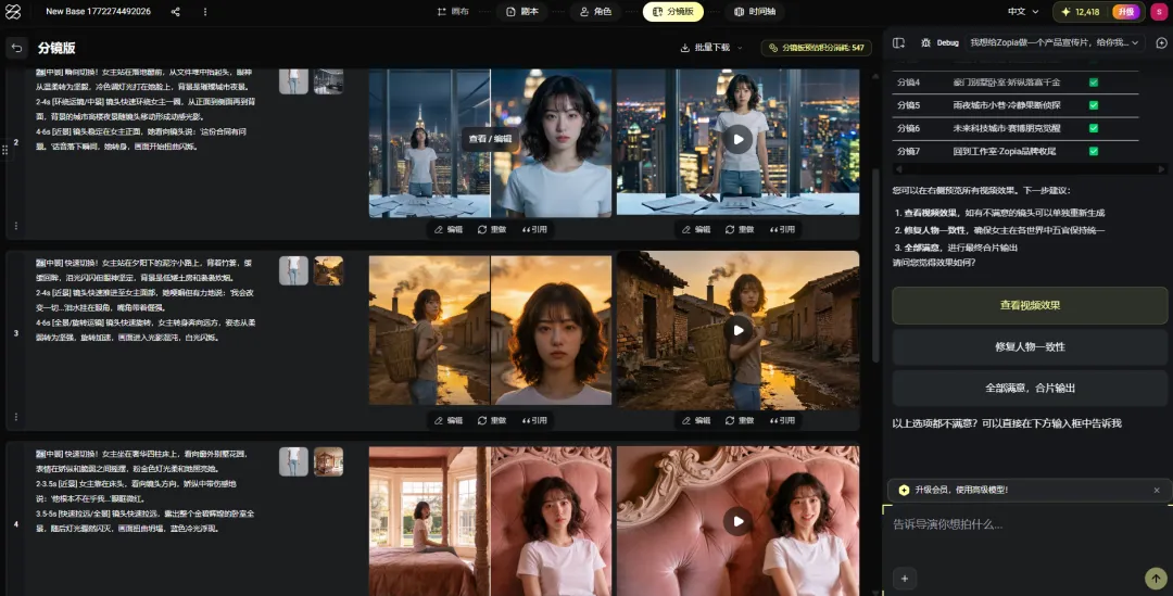 而 Zopia 直接给你配齐了一整套原生 AI 打工天团,从剧本到成片全流程专「人」专岗,你只需要当甩手掌柜总导演