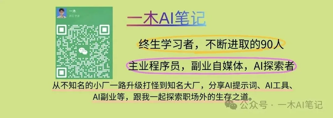 我是一木,宝爸,自驾行业,大厂程序员,知乎满级,写过32万+阅读量的文章。AI领域探索者,专注于用AI赋能工作和生活。喜欢写作、英语、吃鸡、运动。让我们一起努力提高自己、努力挣钱,早日过上自己想要的生活,跟我一起探索职场外的生存之道。