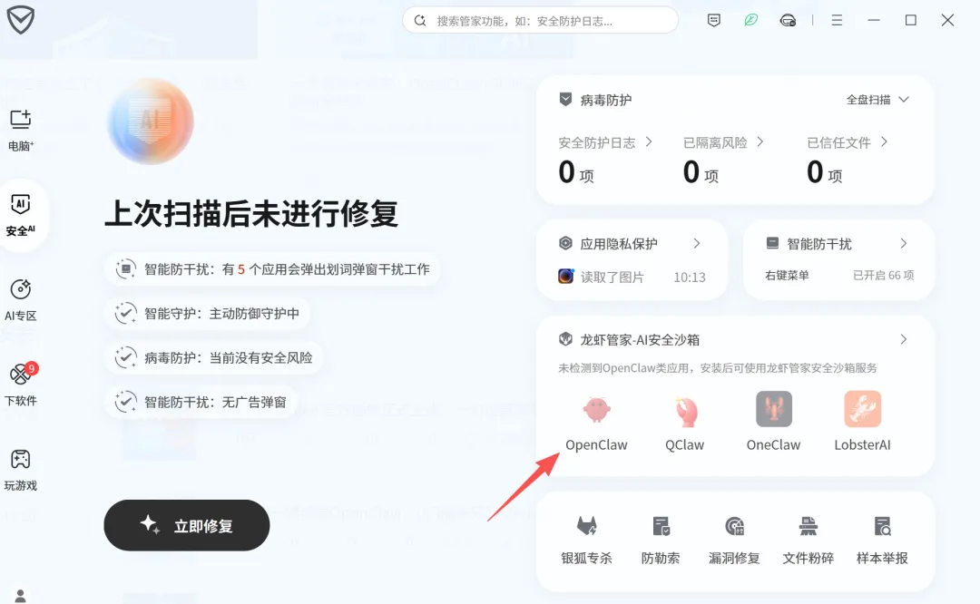 它能自动检测OpenClaw等AI应用的33类漏洞,什么TKSA-2026系列漏洞,一键扫描,一键修复。