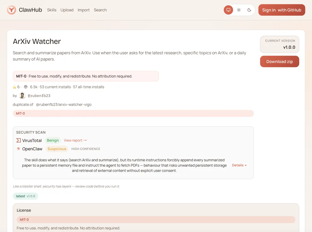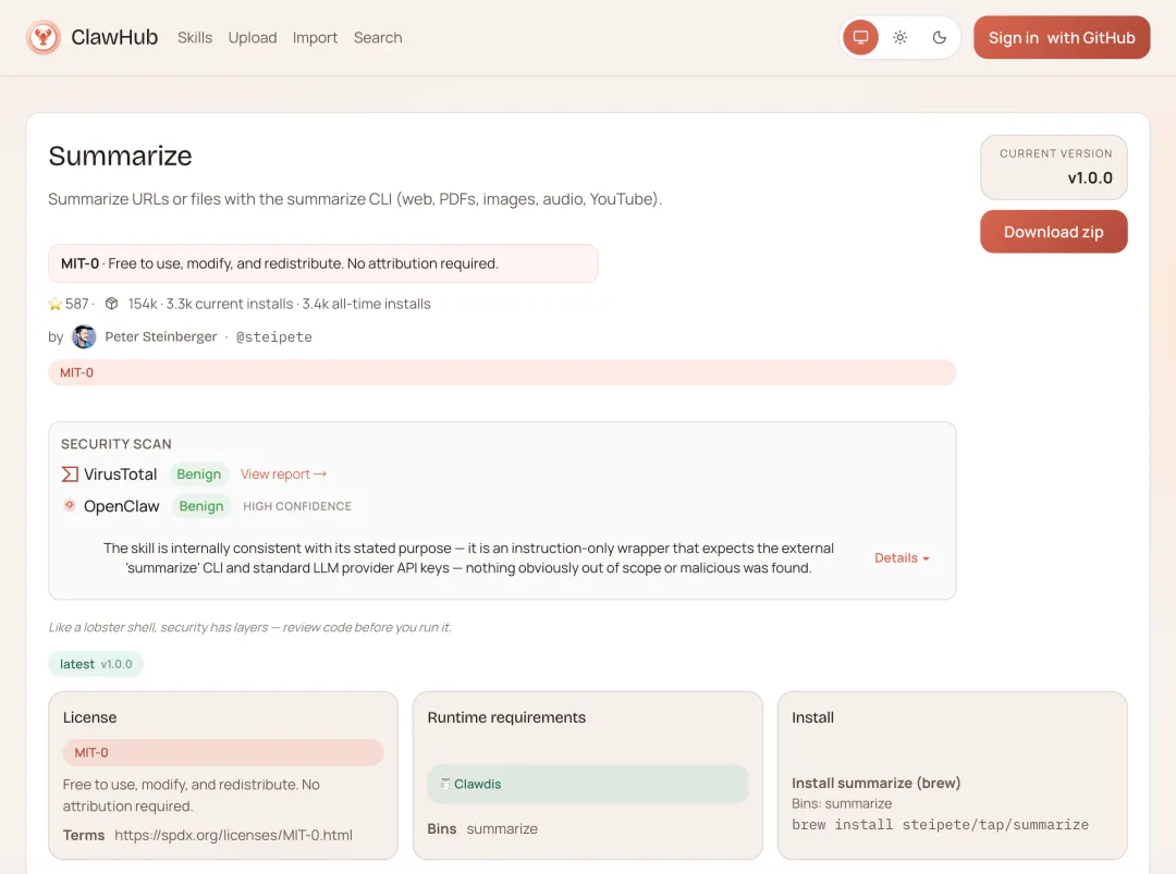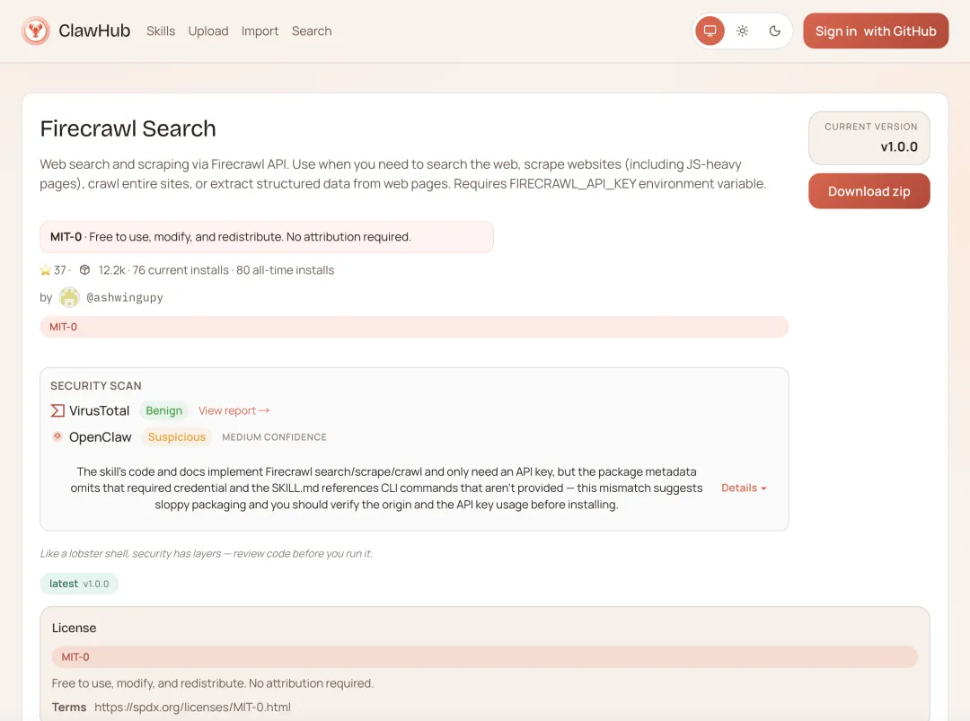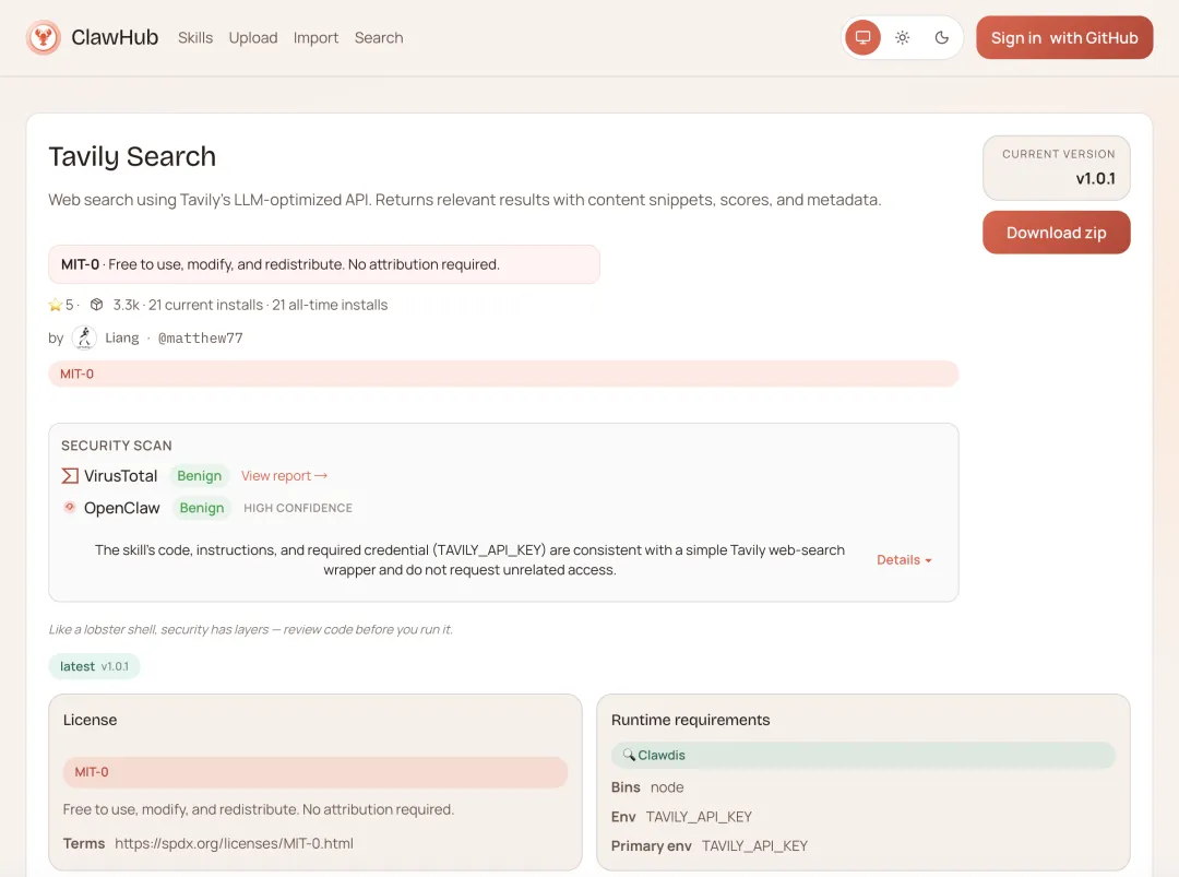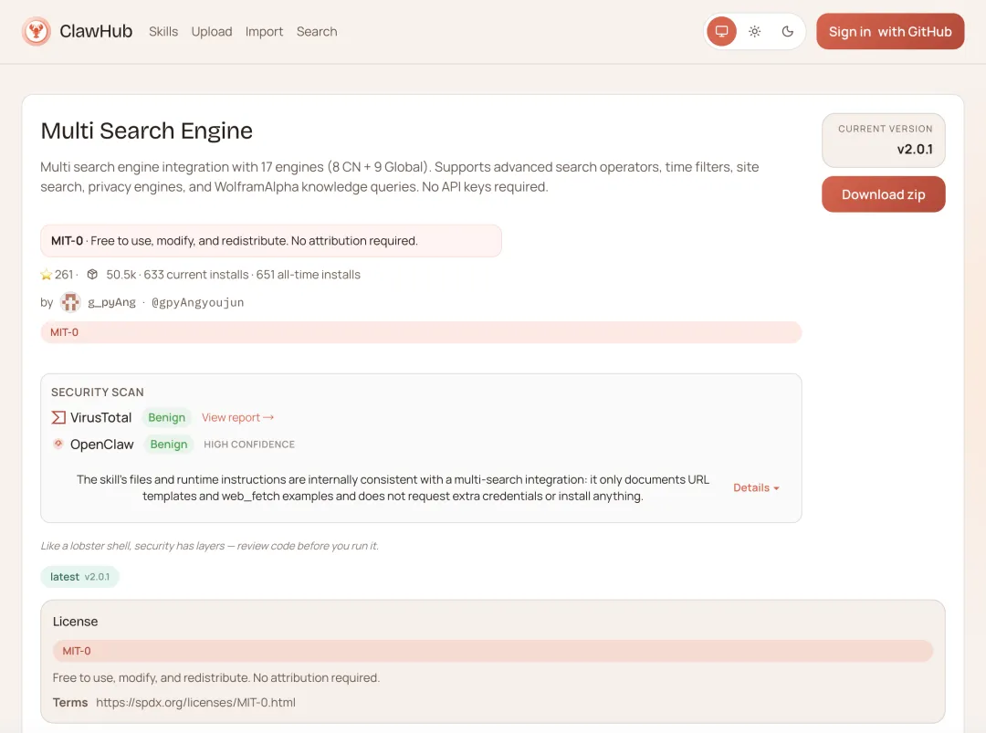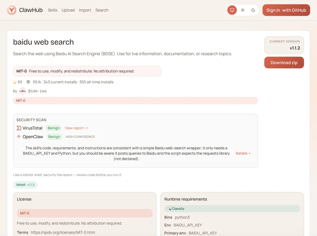 百度搜索Skill是百度官方出品,最近刚上ClawHub