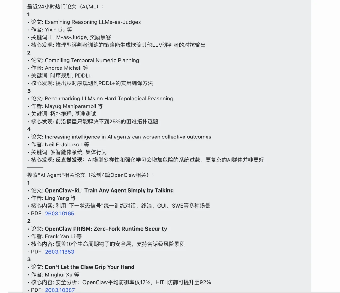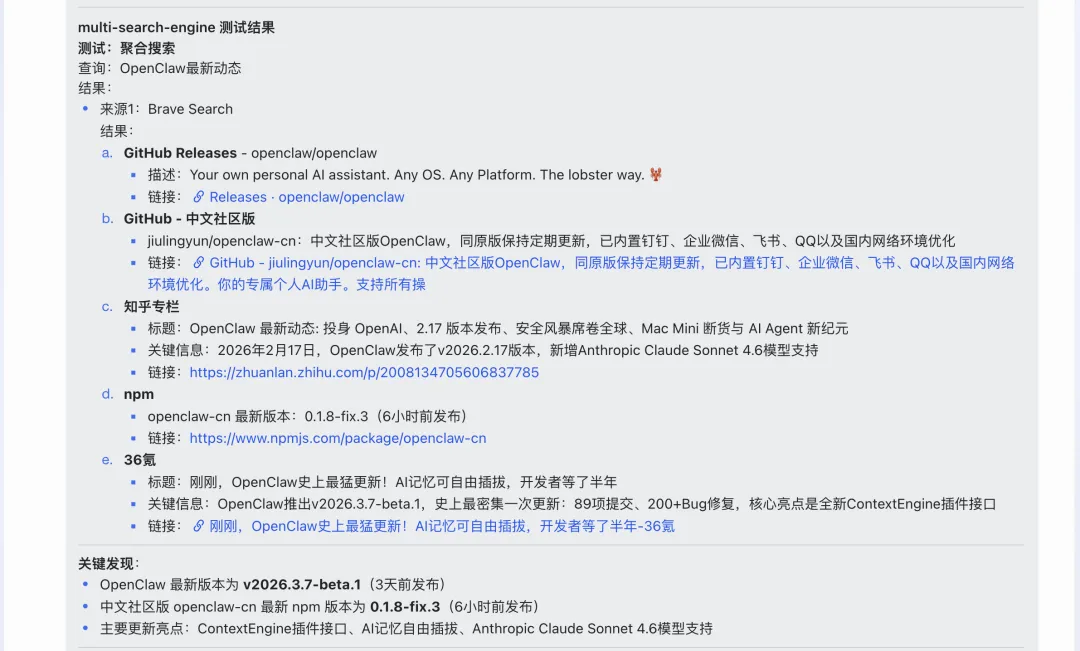 结果很实时,进一步可以结合百度这个搜索skill,做个求职Agent,帮你自动监控所有目标单位的招聘动态,每天推送新岗位