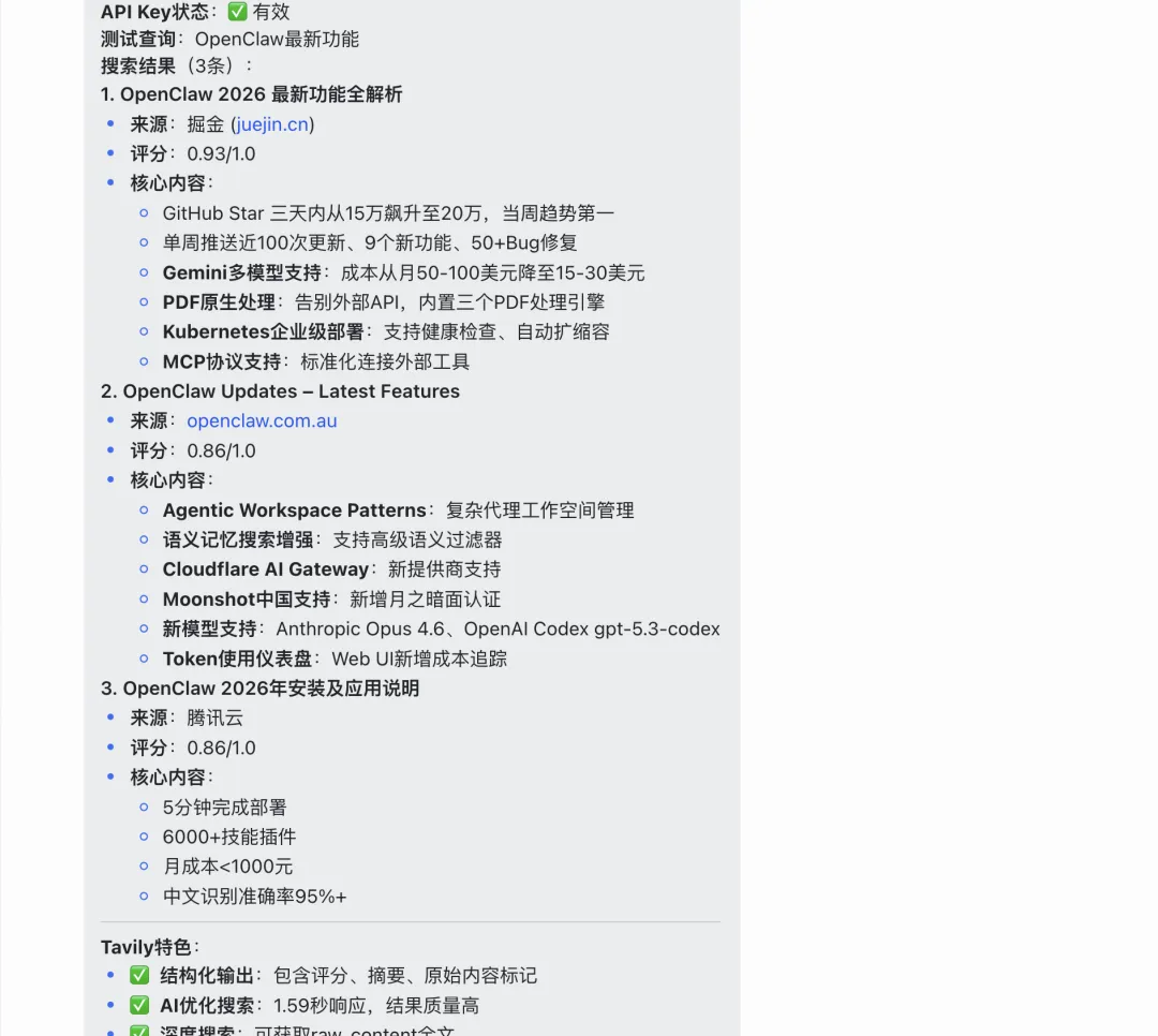 为什么强:它是目前公认的最佳公网信息源。Tavily不会返回"10个蓝色链接",它会在后台把无用的网页代码剥离,直接给小龙虾返回结构化的干净文本