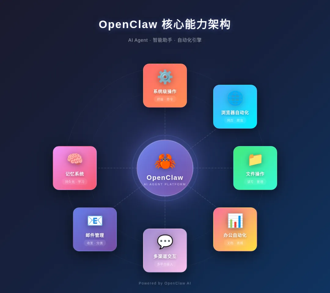 ✅ 以上全部 ✅ 直接操作你的文件系统 ✅ 控制浏览器自动填表、爬数据 ✅ 执行终端命令、跑脚本 ✅ 通过微信/Telegram/Slack 随时待命 ✅ 记住你的偏好,主动提醒、主动执行