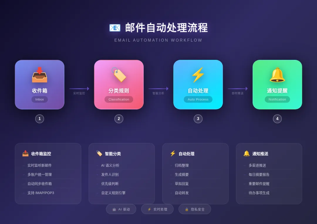 配置 IMAP 账号(支持 Gmail、Outlook、企业邮箱) 设置分类规则 让它自动执行