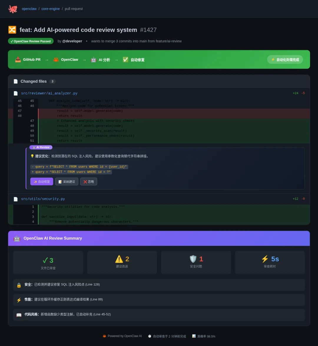 我们团队用了一个月,**PR 审查时间减少了 60%**,低级错误基本绝迹。AI 会指出"这个函数没处理异常""这个循环可能死循环",比人眼还尖。