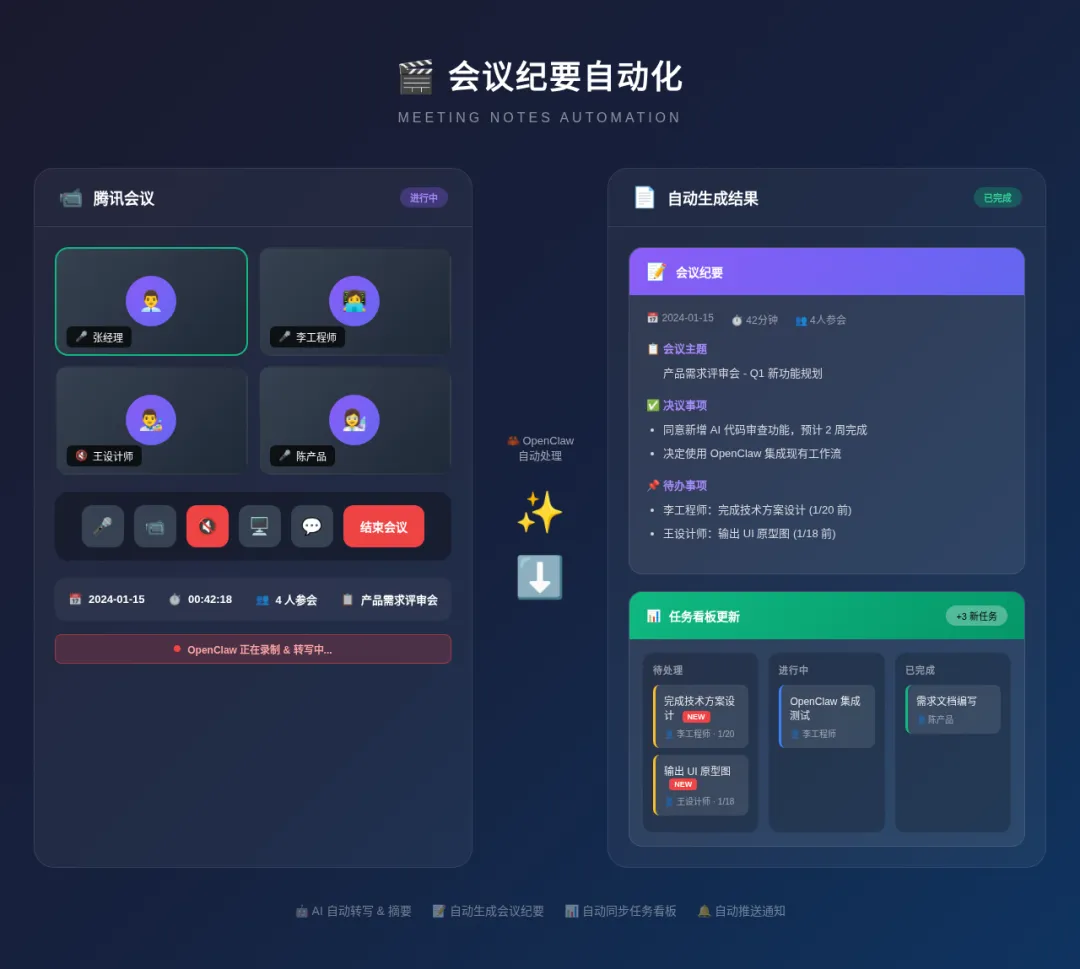 痛点: 开会两小时,整理纪要半小时。还要手动更新任务看板。
