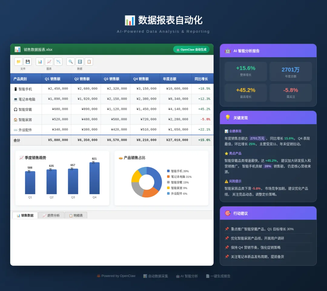 痛点: 每周/每月要手动拉数据、做表格、写分析,重复劳动。