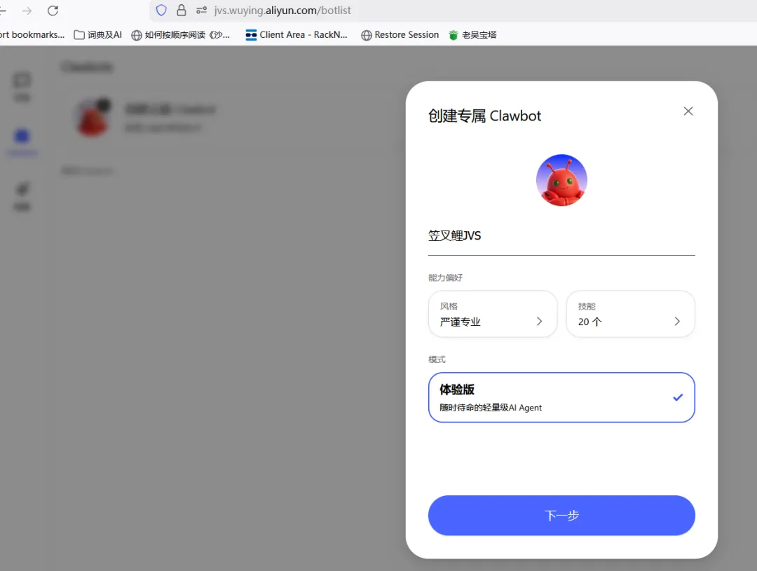 图 2:网页创建 Clawbot 界面,选择风格、技能和模式