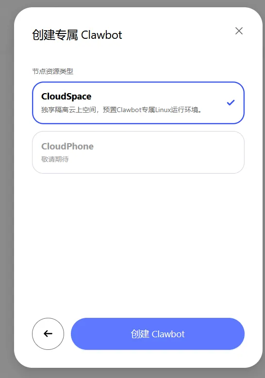 图 3:选择 CloudSpace 类型,独享隔离云上空间,预置 Clawbot 专属 Linux 运行环境
