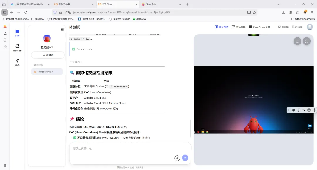 图 4:网页版 JVS 界面,左侧为聊天窗口,右侧为远程桌面,可实时查看 AI 操作