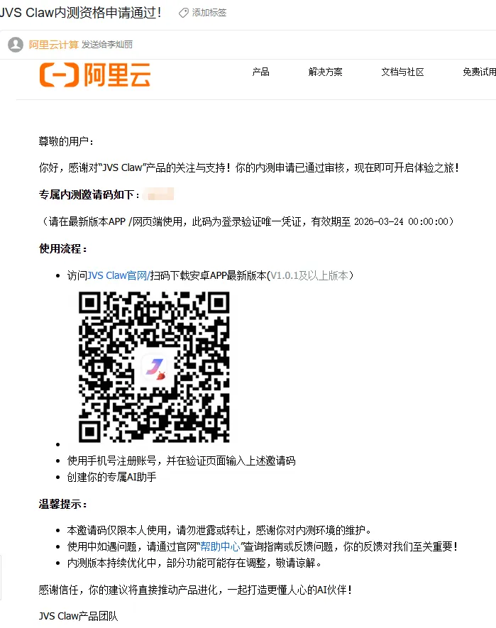 图 1 再次展示:内测邀请码邮件,包含下载二维码和使用流程