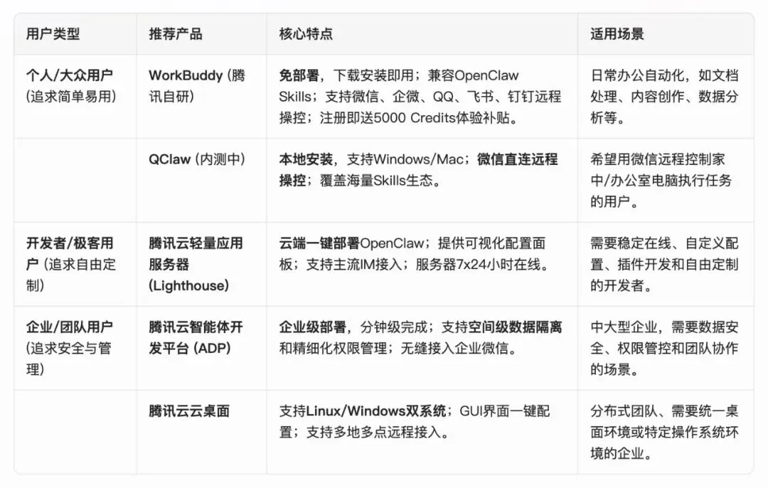 这里有一份腾讯「龙虾全家桶」选用&安装指南,帮助你快速入手!腾讯推出“龙虾”全家桶以来,对于很多想入门的小白来说,看的有些眼花缭乱,不知道哪个龙虾才是适合自己的,以及产品之间有什么不同。因此,特意整理了一份腾讯版「龙虾」的选用及安装指南,仅供参考。-不想折腾,马上就用:选 WorkBuddy。-喜欢本地安装,且想微信远程控制:关注 QClaw内测。-开发者,想自己折腾和定制:选腾讯云 Lighthouse。-为企业或团队部署,需要高级安全和管理:选腾讯云智能体开发平台 (ADP)或腾讯云云桌面安装与部署指南方案A:个人用户零门槛方案 (WorkBuddy)目标:最快1分钟开始使用。步骤:1、下载:访问官网 https://www.codebuddy.cn/work/ 下载并安装WorkBuddy。2、启动:安装后打开软件,直接在对话框输入指令即可开始使用。3、(可选)连接IM远程操控:- 连接微信:在软件内点击右上角【Claw设置】→【微信客服号集成】→扫码绑定,即可在微信对话。- 连接企业微信/QQ等:在【Claw设置】→【集成】中,选择对应平台按指引配置(通常需获取Bot ID和Secret等信息填入)。方案B:开发者云端部署方案 (腾讯云Lighthouse)目标:在云端获得一个可自由配置、24小时在线的OpenClaw实例。步骤:1、创建服务器:- 登录腾讯云,进入【轻量应用服务器Lighthouse】购买页。- 新建实例> 镜像选择【应用模板】> 【AI智能体】>勾选【OpenClaw (Clawdbot)】。- 选择套餐(推荐2核4G以上)和地域,确认开通。2、获取管理信息:- 在控制台找到该实例,进入【管理实例】>【应用管理】,获取后台管理密码。- 确保防火墙放行必要端口(如80、443等)。3、登录配置后台:- 通过提供的访问地址和密码,登录OpenClaw可视化配置后台。4、配置AI模型 (大脑):- 进入【Models】面板,填入您的大模型API Key(支持混元、DeepSeek、Kimi、GPT等)。腾讯云用户可使用Coding Plan套餐或领取赠送的100万token。- 选择模型并保存激活。5、接入通讯渠道 (Channels):- 进入【Channels】面板,选择要接入的IM(如企业微信、QQ)。- 根据指引,从对应IM平台获取Bot ID、Secret等信息,填入配置面板并完成配对。6、安装技能插件 (Skills):可通过内置的 SkillHub社区(国内优化版)或 ClawHub,搜索并一键安装所需技能。方案C:企业级部署方案 (腾讯云ADP 或 云桌面)目标:获得安全、可控、支持团队协作的企业级AI智能体环境。通用流程:1、开通服务:在腾讯云开通【智能体开发平台(ADP)】或【云桌面】服务。2、一键部署:在ADP控制台内找到OpenClaw应用模板,一键部署,系统会自动创建隔离的工作空间。3、配置与接入:- 模型配置:在ADP的模型广场配置或接入企业可用的大模型。- 权限设置:根据企业组织架构,在平台管理界面设置不同部门/成员的访问和使用权限。- 渠道接入:通常可快速(分钟级)接入企业微信,实现全员使用。- 知识库接入:支持接入企业内部知识库(如腾讯乐享),让AI学习公司专属知识。- 安全管控:利用ADP内置的企业级安全策略、审计日志,或结合腾讯iOA“龙虾办公网防护方案”进行全链路安全防护。核心技能 (Skills) 拓展指南安装好“龙虾”后,可通过以下方式扩展其能力:1、首选SkillHub:腾讯为中国用户优化的技能社区,提供中文搜索、国内镜像和精选安全榜单,解决下载慢、选型难问题。2、腾讯官方技能:关注腾讯官方及生态产品发布的技能(如腾讯文档、腾讯地图、腾讯广告、乐享知识库等),通常更安全可靠。3、安装方法:- WorkBuddy:在软件内置的插件市场直接搜索安装。- OpenClaw (Lighthouse/ADP部署):在配置后台的Skills模块,通过SkillHub或ClawHub搜索安装,或直接输入GitHub仓库地址进行安装。安全防护建议1、个人用户 (本地部署):安装腾讯电脑管家18.0,使用“龙虾管家”安全沙箱功能,将AI运行在隔离环境中,保护本地文件。2、云端/企业用户:- 使用腾讯云AI Agent安全中心进行实时监控、风险拦截和操作留痕。- 企业部署务必使用腾讯iOA“龙虾办公网防护方案”,实现从安装、执行到数据外传的全链路防护。- 定期使用 EdgeOne ClawScan技能给Agent进行安全体检。腾讯“龙虾”产品矩阵覆盖了从小白到极客、从个人到企业的全场景需求。请根据上述指南,结合自身技术背景和使用场景,选择最适合的产品和部署方案,开启您的AI智能体高效办公之旅。