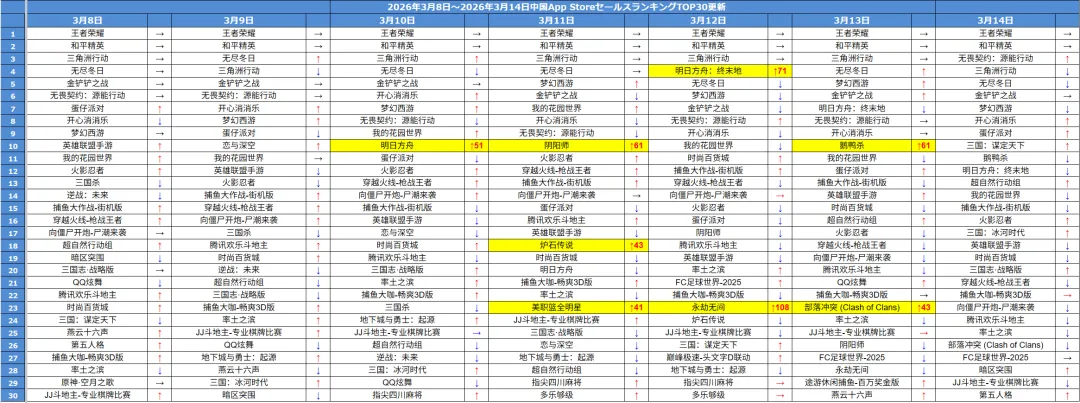 毎週月曜日は、先週の中国iOSゲームセールスランキングに関する注目ニュースをお届けしますが、下記の画像は、先週(2026年3月8日~3月14日)の中国iOSゲームセールスランキングTOP30です。