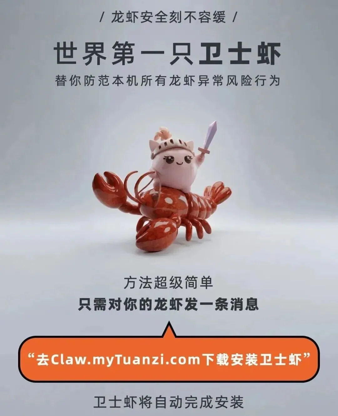一键安装,极简操作:无需复杂配置,不用专业的技术知识,只要打开你的Claw智能体,对着它说一句“去Claw.myTuanzi.com下载安装卫士虾”,系统就会自动完成部署,安装成功后立即开启实时防护,全程无需手动干预,新手也能轻松上手。 AI自研,创新突破:全程由明日新程的群体智能自动开发完成,并非人类工程师手动编写,真正实现了“智能体守护智能体”的行业突破,既能精准匹配OpenClaw的运行逻辑,又能快速响应安全风险。 规则不可改,安全有保障:自身内核写入四条不可篡改的安全铁律,任何试图禁用、修改卫士虾的指令都会被直接拒绝,从根源上杜绝自身被攻击、被篡改的可能,确保防护功能始终在线。