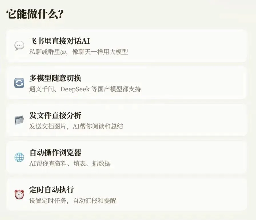 以飞书为例,接入OpenClaw就能直接操作飞书多维表格、文档、日历、群聊与任务。