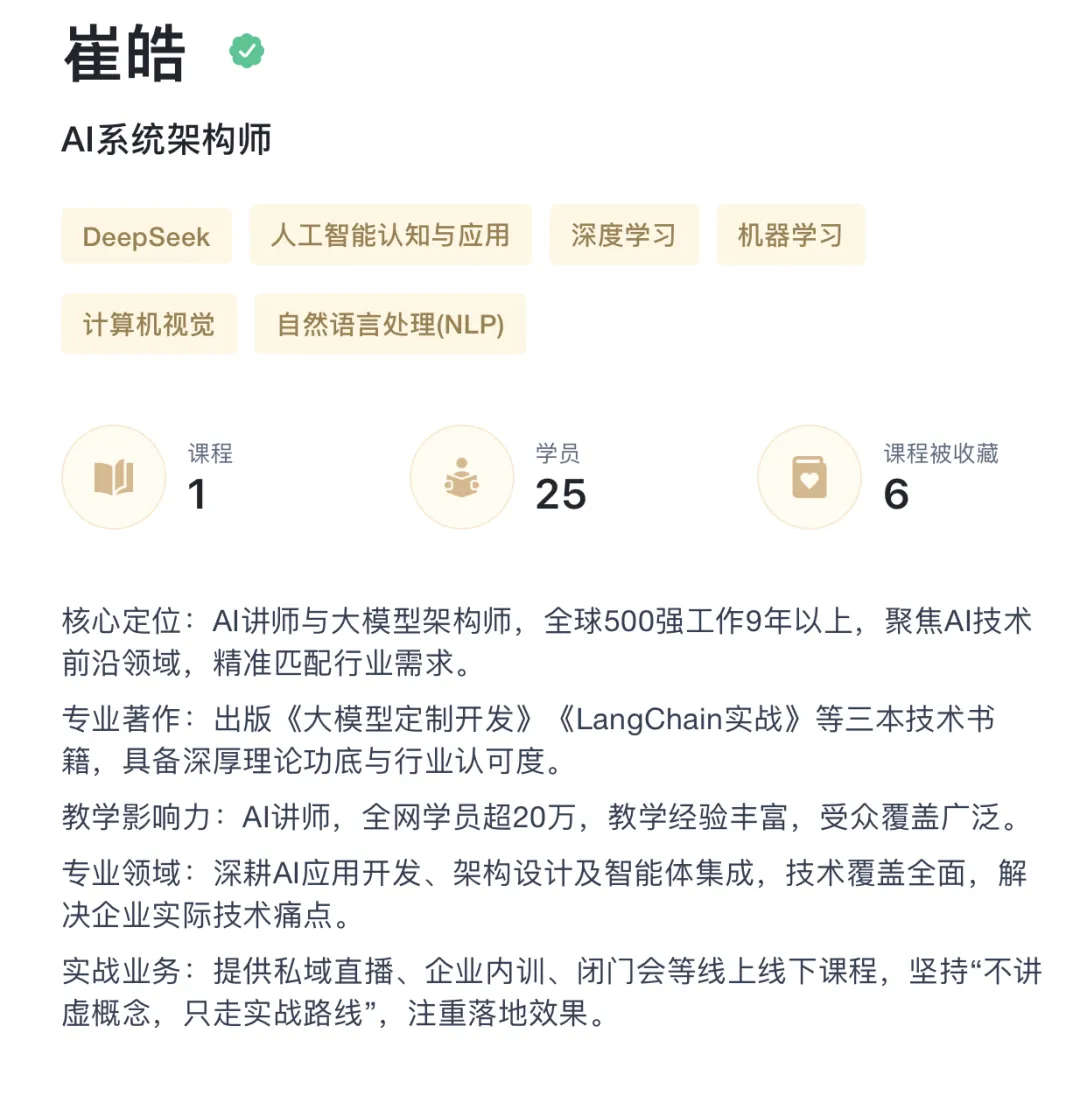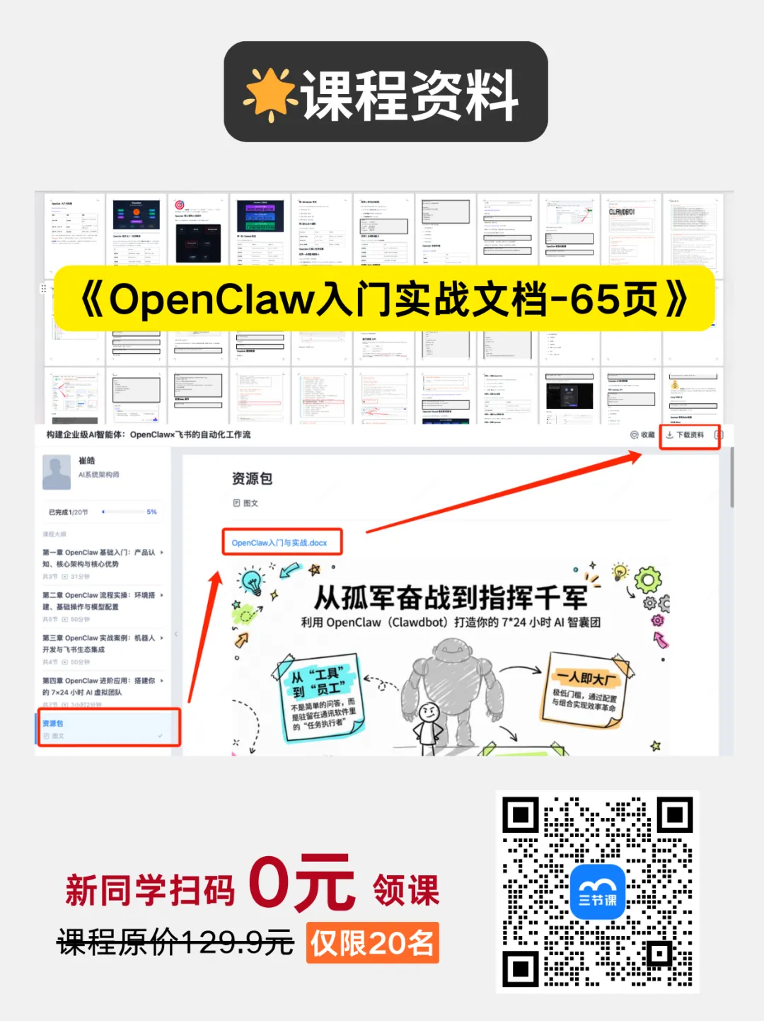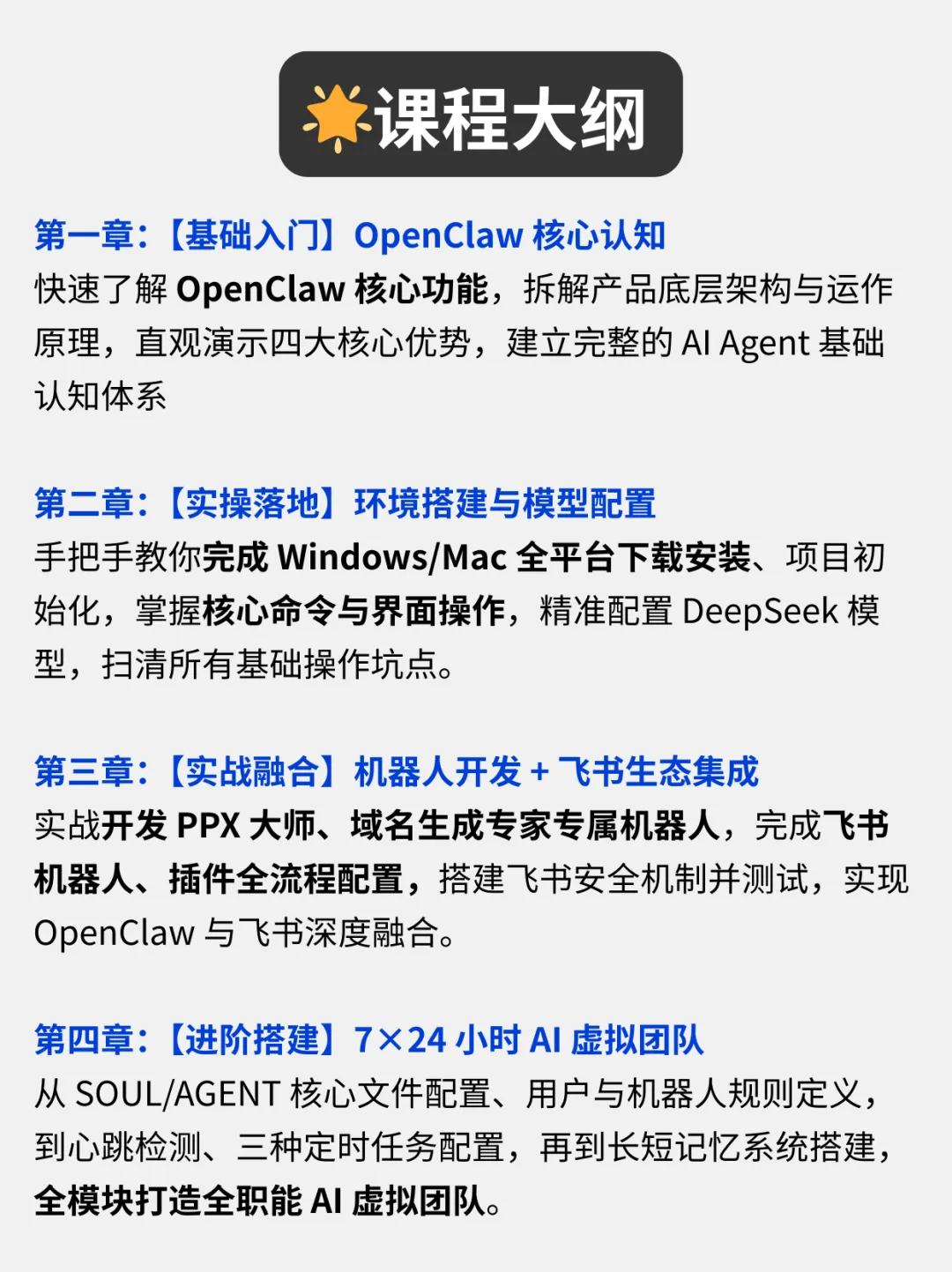 这门《OpenClaw×飞书的自动化工作流》实战课程共 4 章,内容从OpenClaw核心认知👉工具安装👉飞书实战👉团队搭建,一步步带你由浅入深的掌握OpenClaw,小白也能轻松跟上节奏!内容全是一线实战干货,分步骤演示教学,每一个操作都有详细讲解,把网上零散、踩坑的教程整合归一,帮你省去99%的试错时间,真正做到学完就能用、用了就提效。用大白话讲清“龙虾AI”的核心逻辑,不用懂专业术语,也能知道它到底能帮你做什么、怎么用,再也不用被复杂术语劝退;手把手教你Windows/Mac双平台安装配置,精准对接DeepSeek等主流模型,扫清安装报错、环境配置的所有坑;一步步教你完成飞书机器人、插件全流程配置,搭建飞书安全机制,让OpenClaw与飞书深度融合,真正融入日常办公。除了这些干货内容,课程还有一套完整的《OpenClaw入门实战文档》,帮你扩充对龙虾AI的了解和提高应用技能。不管你是普通办公族想摆脱复制粘贴、统计报表的重复活,还是创业者想低成本搭建AI团队,这门课的技能都能直接用,刚需又实用!本门课程的授课老师崔皓老师,是深耕AI与分布式架构领域18年的实战派专家,拥有10年分布式架构经验,被全网20w+学员验证过的靠谱讲师。还曾出版过《LangChain实战》《分布式架构原理与实践》等畅销书。跟着他学,你不用再到处找教程、不用反复踩坑,就能快速掌握OpenClaw全流程操作,轻松实现飞书集成,搭建专属AI虚拟团队,真正实现“一人即大厂”的生产力跃迁。现在扫码 0元 领课,就能跟着老师一起学习OpenClaw的实战方法。除了以上这门课程,三节课目前还有多门OpenClaw的课程。课程覆盖基础入门、使用技巧、开源部署、企业应用、技术原理等板块,适合不同阶段的同学来学习。能帮助大家快速了解OpenClaw,以及掌握OpenClaw的使用技巧~如果你对OpenClaw感兴趣,都建议先扫码0元领取课程,给自己一个尝试的机会👇