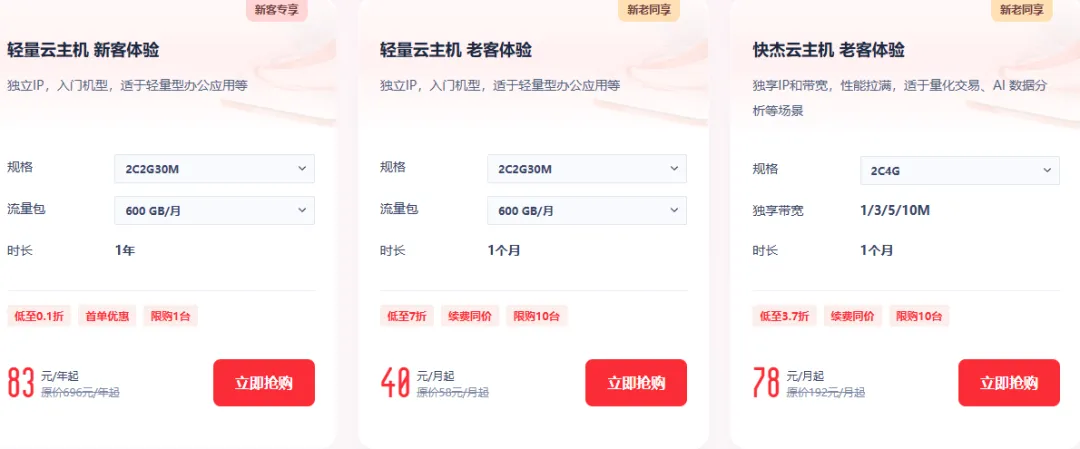 其中轻量应用服务器、云服务器支持海外地域,低至68元1年,7*24无间断运行,独立部署环境,可按需调整实例规格,性能与成本更可控。
