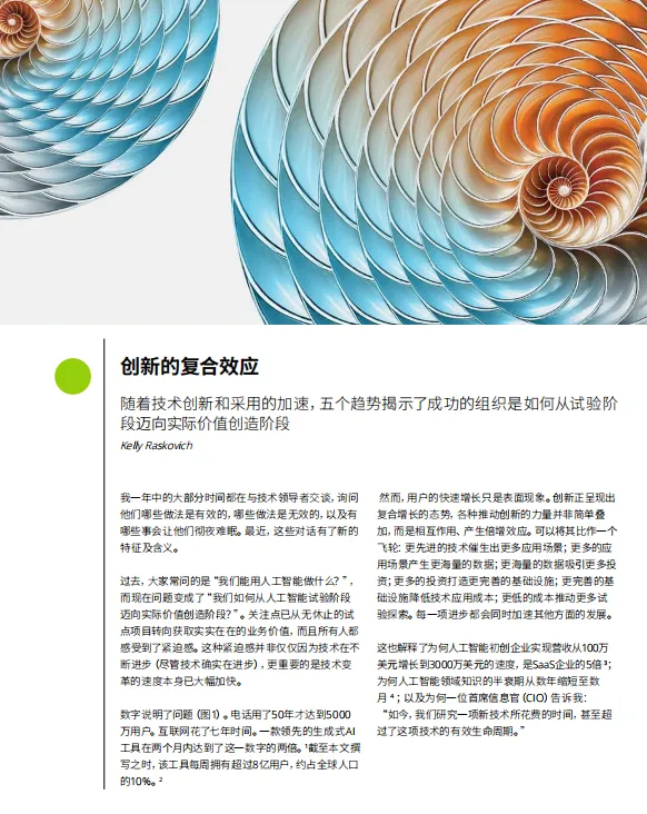 报告以“创新的复合效应”为总纲,指出AI发展已进入指数级加速阶段——技术、数据、投资、基础设施之间形成了相互强化的“飞轮”,企业若仅依赖渐进式优化,将难以跟上这一节奏。在此背景下,报告提出了五大核心趋势: