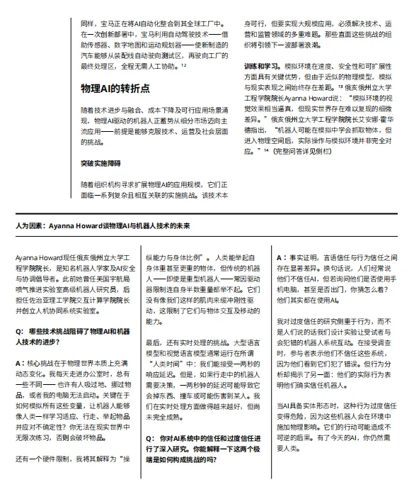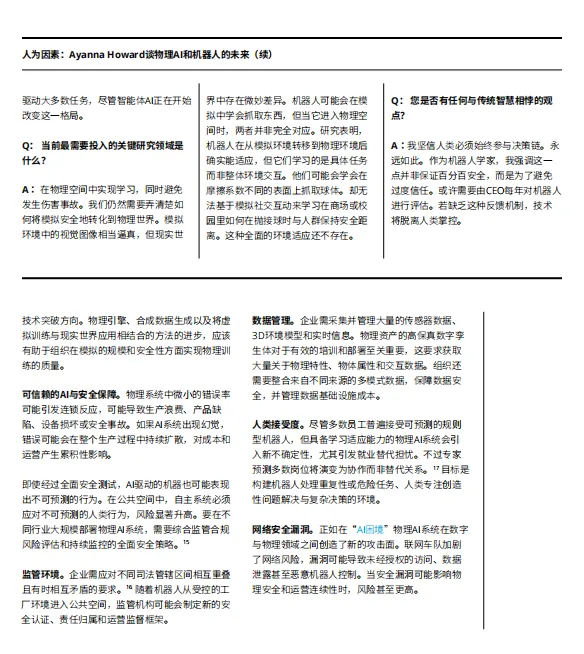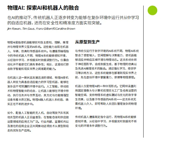 物理AI:AI与机器人深度融合,从预编程设备转向能在复杂环境中自主感知、学习和执行的自适应系统,人形机器人、生物混合机器人和量子机器人等前沿方向正在成型。